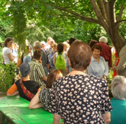 Hofbegrünung, Pflanzen in der Stadt, Eigenversorgung. Die BewohnerInnen befassen sich mit urban gardening, Hochbeeten, Kompostieren, Selbstversorgen.